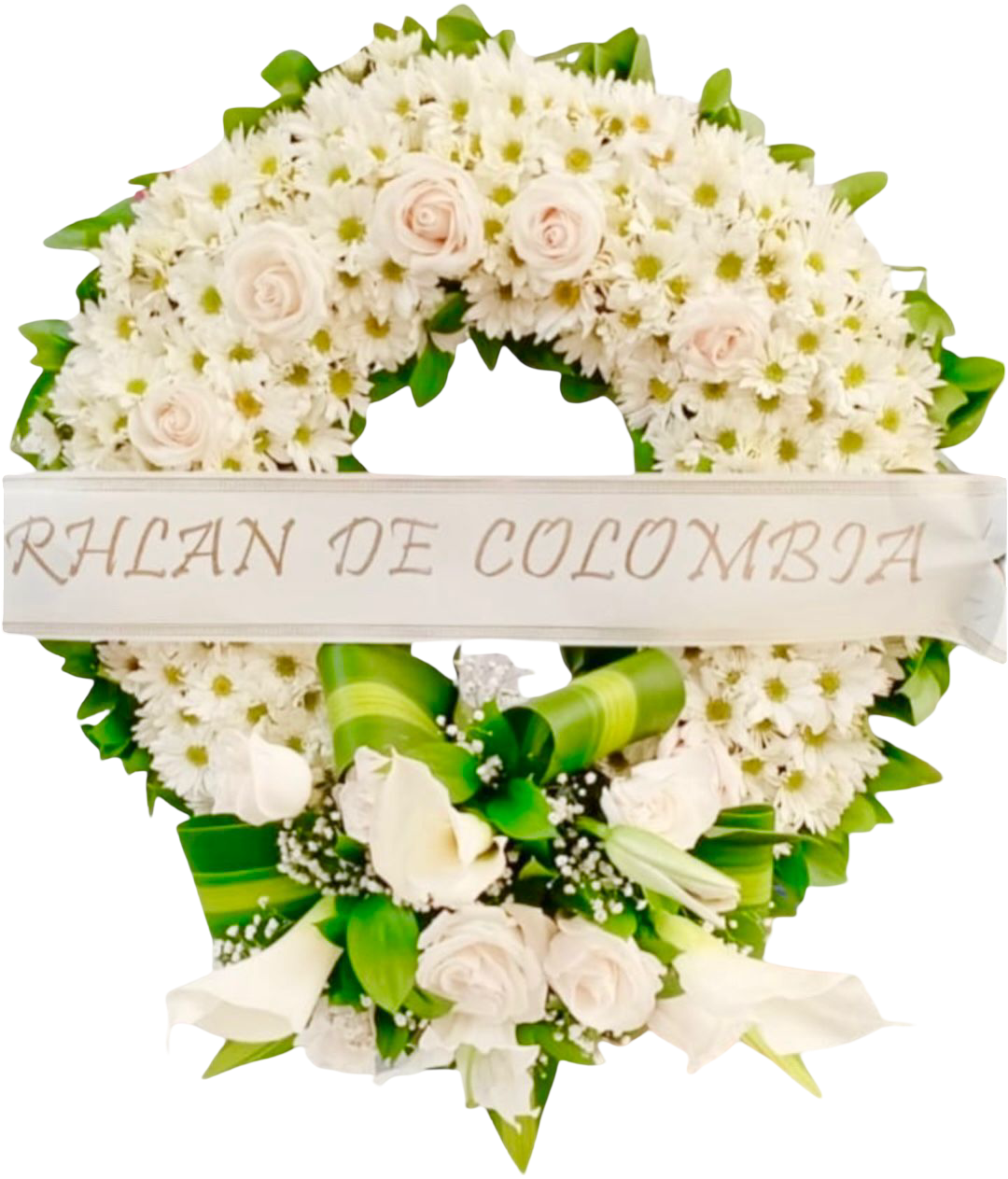 corona anillada con rosas full y Margaritas y aplique de cartuchos y rosas