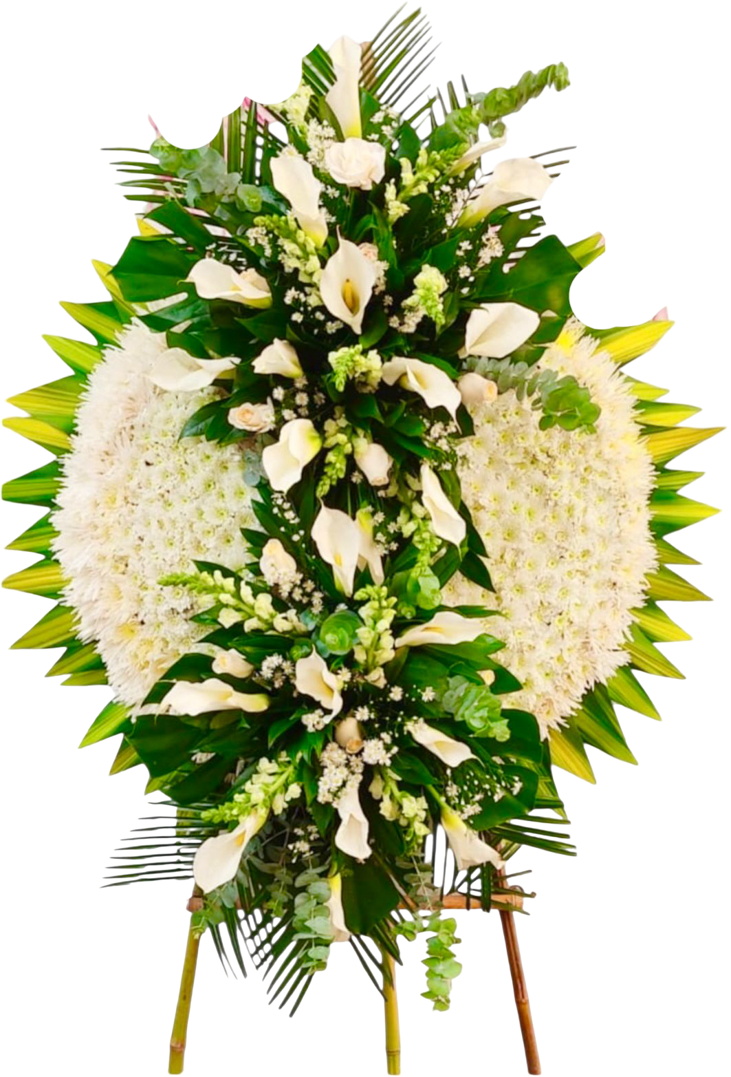corona grande con diámetro de 1 metro con aplique a los lago con cartucho y flores surtidas sobre pedestal