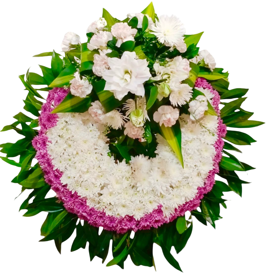 Hermosa corona blanca con línea lila y aplique en flores surtidas