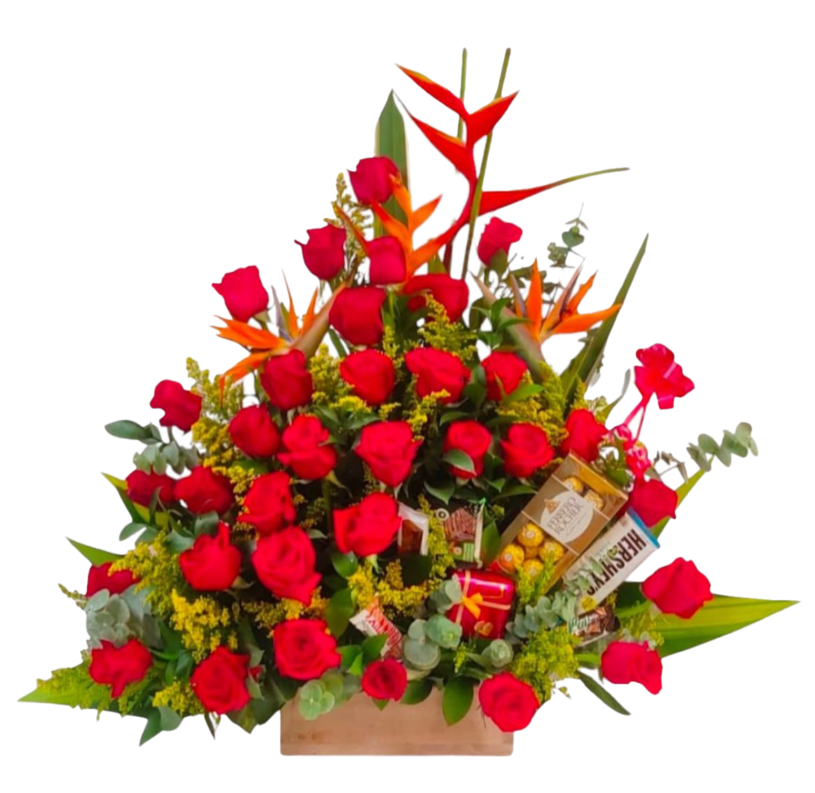 Arreglo florar sobre base artesanal elaborado con rosas rojas flores exóticas de tamaño grande , incluye 5 tipos de chocolate diferentes